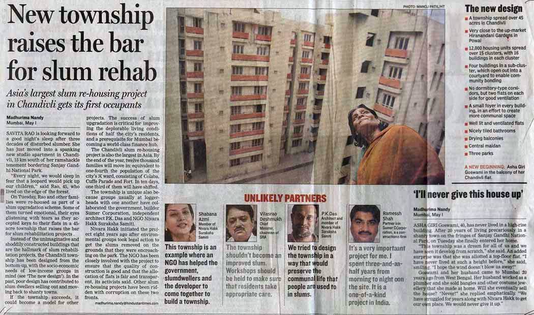 The project involves the rehabilitation of slum-dwellers evicted from the Sanjay Gandhi National Park. The rehabilitation site at Chandivali, measuring about 34 hectares, will constitute a comprehensive and all-inclusive new town. The town, with 18,362 houses, includes a large, 1.6- hectare maidan as its central, social space. Two more playgrounds and over 60 community open spaces enliven its outdoors. More than 14 schools, medical facilities, including two hospitals, two large community halls and religious institutions, constitute its social infrastructure. Schools and community halls are annexed to these open spaces and playgrounds.