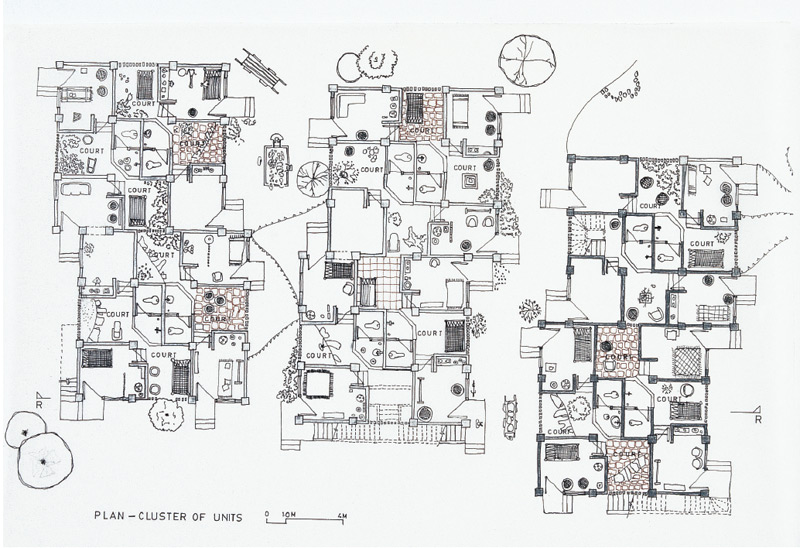 Planning principles: The plan proposes plots larger than the plinth area of every house in order to create a compulsory, open-to-sky space, a place to cook, sit out, wash clothes and sleep. Common, open spaces are along the accesses, forming chowks for gettogethers and spaces for the children to play. Since every house was to be built and extended according to the individual's means, subsequent repairs and maintenance too became simple without dependence on professional help, nor linked to the status or consent of neighbours. An open space in the north, along the hill, acted as a buffer and protected the houses from possible landslides. A fairly large part is to be used for common facilities such as toilets and water taps. Also, extensive tree plantation is planned. A large, common space required for get-togethers, festivals and children to play is provided along with the welfare centre.