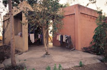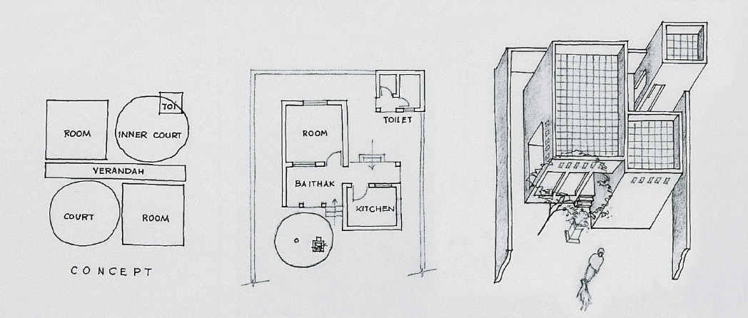 The rooms develop around the open-to-sky angans and face opposite directions, but are held together by a verandah. The inner angan relates to the kitchen and houses the toilet. Two separate rooms ensure privacy and keep away the kitchen smoke from the living area. The outer angan constitutes the baithak and a space for storing farm produce.