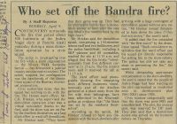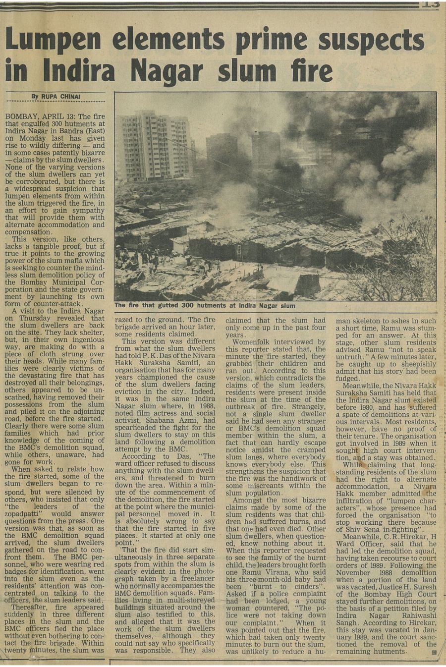 When other methods failed, a new method for eviction was used. In April 1991, lumpen elements in collusion with BMC and police officials set Indira Nagar slum on fire. On 8th April, 485 houses were gutted by fire suspected to have been lit by a BMC demolition squad led by ward officer Mr.Herekar of H/East ward. The BMC squad had come for demolitions, the officers started talking to the slum dwellers and kept them engaged, meanwhile some officers and lumpen elements entered huts and soon those portions were on fire. Women ran to rescue their children and whatever belongings they could. No fire brigade was called for a long time.