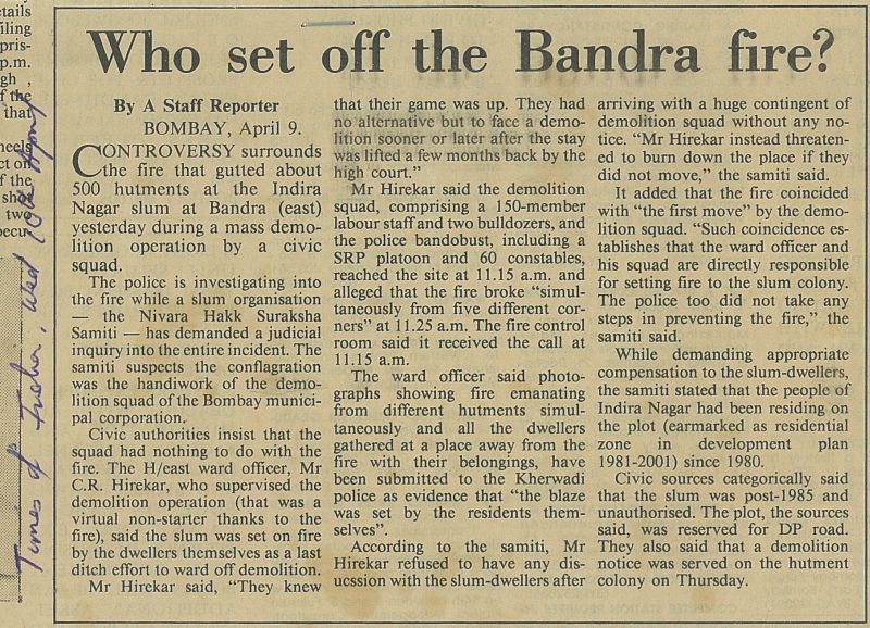 On 8th April, 485 houses of Indira Nagar, Bandra east were gutted by fire suspected to have been lit by a BMC demolition squad led by ward officer Mr.Herekar of H/East ward.