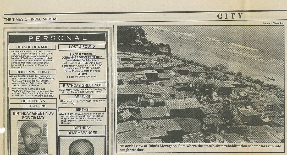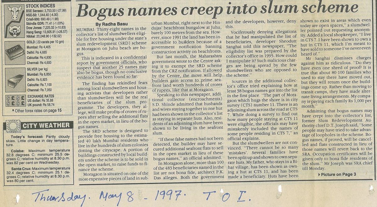 In 1996, Moragaon Kohli Samaj Seva Sangh had written letters to the then Chief Minister Manohar Joshi about unauthorized construction and land filling in Juhu Mora Village by Messrs Privincial Housing and Private Ltd. In August 1996 residents wrote to Nivara Hakk Activist P.K.Das saying boulders weighing 100 kgs each were being dumped on the sea shore, huts were being raised in the name of SRD scheme and access to sea for 150 fishermen families was blocked. The residents requested the SRA officials to visit the site and take note of these unscrupulous activities.