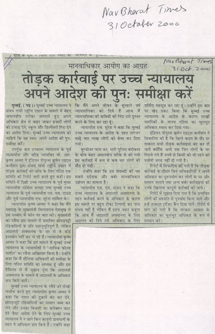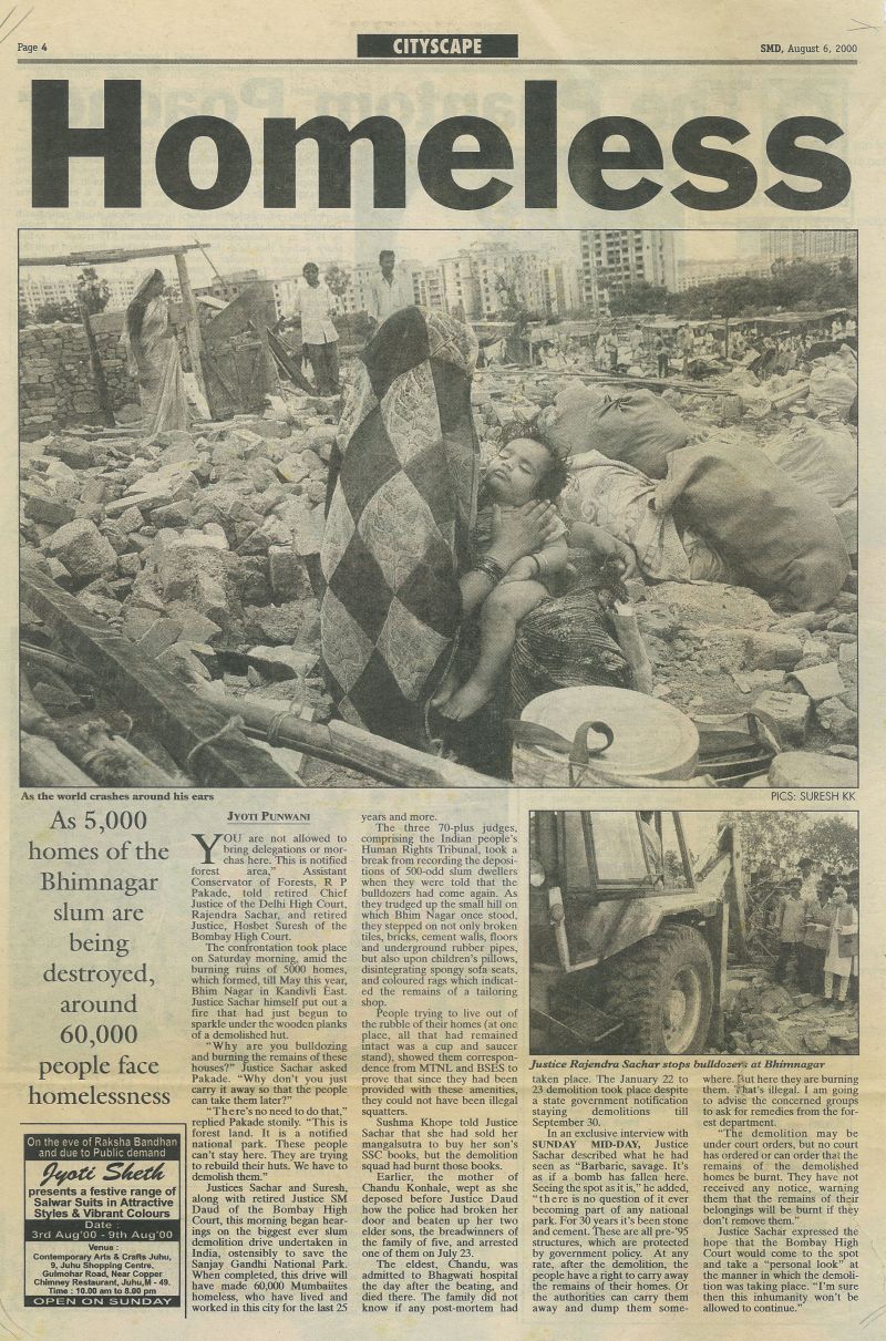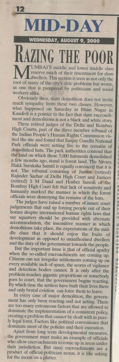 August 4, 2000- Express Newsline – The Indian people’s Human Right Commission (IPHRC) will be holding a 2 day public hearing on the demolitions in SGNP under the aegis of an unofficial judicial inquiry tribunal. The terms of reference of the tribunal set up will include human, constitutional and juries prudential dimensions of the demolitions, the circumstance and conditions under which the court have ordered the demolitions, the responsibility of the courts to ensure that the housing rights of the evictees are protected.