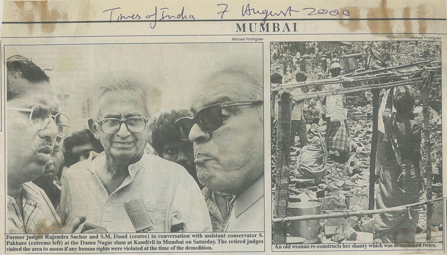 The Tribunal held sittings in Kurar village, in Malad, and in Bhim Nagar, in Kandivili. Among the highlights of the depositions was one where V.P.Singh personally came to give evidence based on what he had seen and heard in his rounds in the national park. Evicted residents provided proof of how Forest conservator A R Bharti, while unleashing a reign of terror on their juggis, was protecting scores of Godmen, babas and ashrams that had occupied huge tracts of land in the forest. In another instance, when the Commission was holding a hearing in the Budh Mandir at Bhim Nagar slums, in Kandivili, a large posse of police and demolition workers arrived with Porclain cranes and JCBs and carried out demolitions under the very noses of the judges. The first hand experience of the misery of eviction shook them up. It was captured poignantly in a photograph published in many main line newspapers of Justice Rajinder Sachar offering a bottle of water to a grieving lady sitting amidst the ruins of her home.