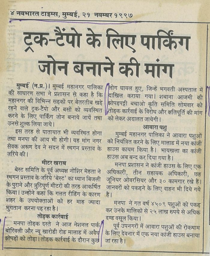 9th April 1996 : Times of India – 'Park encroachers to be included in slum scheme'.