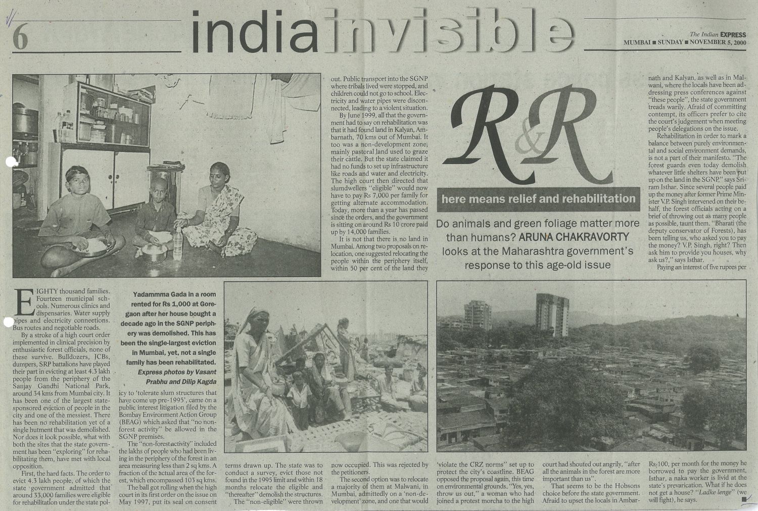 Instead of targeting the land sharks and the corrupt officials who 'sold' these plots to the unsuspecting poor, the environmental groups focused on the slum-dwellers as the villains of the encroachment. What has followed is a two-decade long struggle between the environmental groups seeking eviction of the people, and the Nivara Hakk strongly supported the right of housing with dignity. It is one of the few torturous struggles that actually ended with success. About 12,000 families have already found homes in basic, multi-story buildings at Chandivili, Powai, and another 15,000 are awaiting their turn in Phase II of the project. With nearly 60,000 residents having found homes, and another 75,000 yet to come, the Sangharsh Nagar settlement is equivalent to a 'B' class city, and the largest rehab project in Asia today.