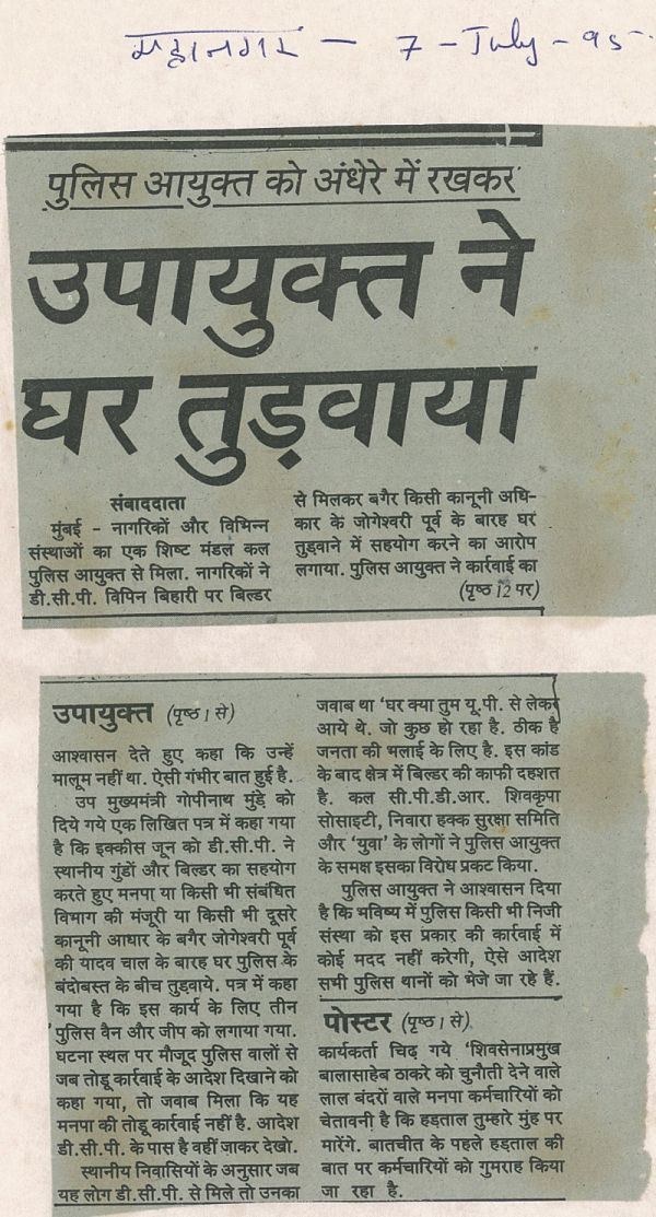 8th July 1997: Letter to Dhindoshi police – Request action on group of unscrupulous elements in pimpripada slums led by K Prajapati and K Ghobhare on cheating people in name of slum redevelopment scheme.Some people were acting as builders and were collecting money from the residents promising them rehabilitation in buildings.