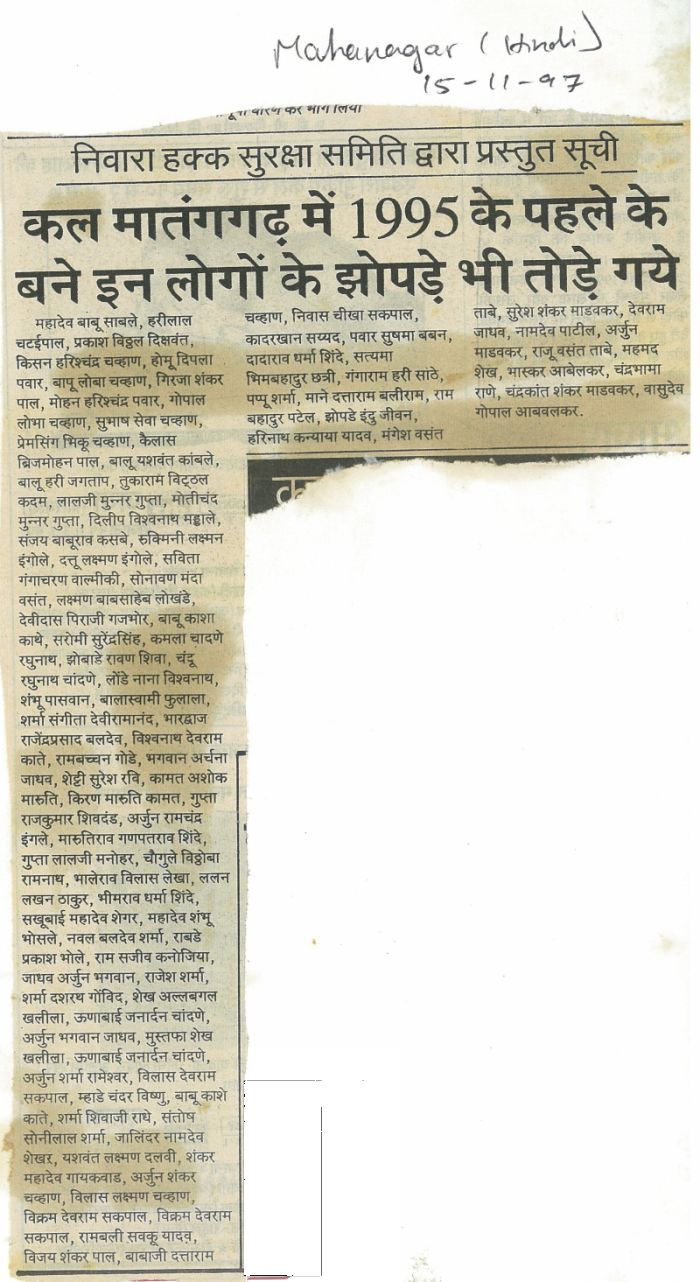 May 20, 1997- 700 residents lost their worldly belongings and forest officials denied anything to do with the demolitions. After demolition, some elements using the fear and tension of the people are telling them that they have brought a builder who will rehabilitate them in the very same plot provided they sign an agreement and pay Rs.200 per room. Nobody can obviously be rehabilited at the same plot. No housing society has been formed nor any general body held authorizing these persons to collect the said money. Also government doesn’t allow for private collection of money in this manner.
