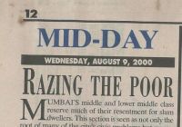 6th April, 1996: The Metropolis- Unrepresented slums to boycott polls. These slums have not been included in SRS scheme as national park land falls under central government. The recent affidavit states the scheme would be applicable to those hutments in slums which have been in existence in the year 1985, the further criteria being a person who claims protection also ought to be in the voters list of Jan 1, 1996 or prior there to and should have continued to stay in the same structure. This affidavit will affect 30 lakhs slum dwellers whose huts were constructed after 1985. This provide it to be a pre-election promise only to gain votes. If the government is honest to eradicate slums, it should not put any cut-off date as eligibility criteria.
